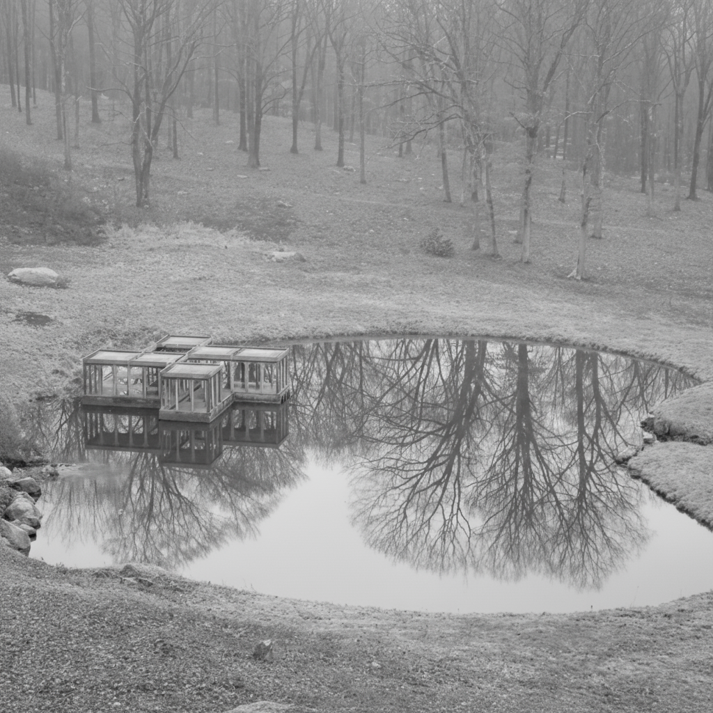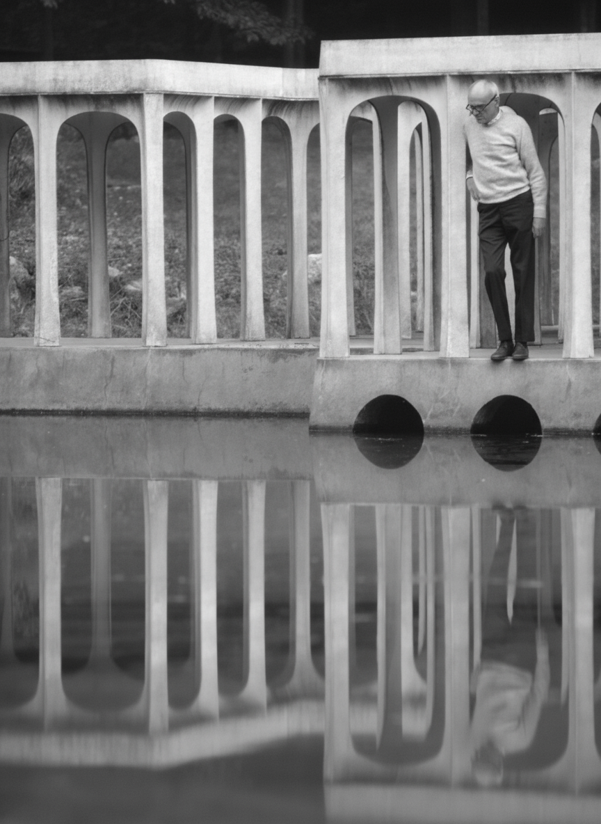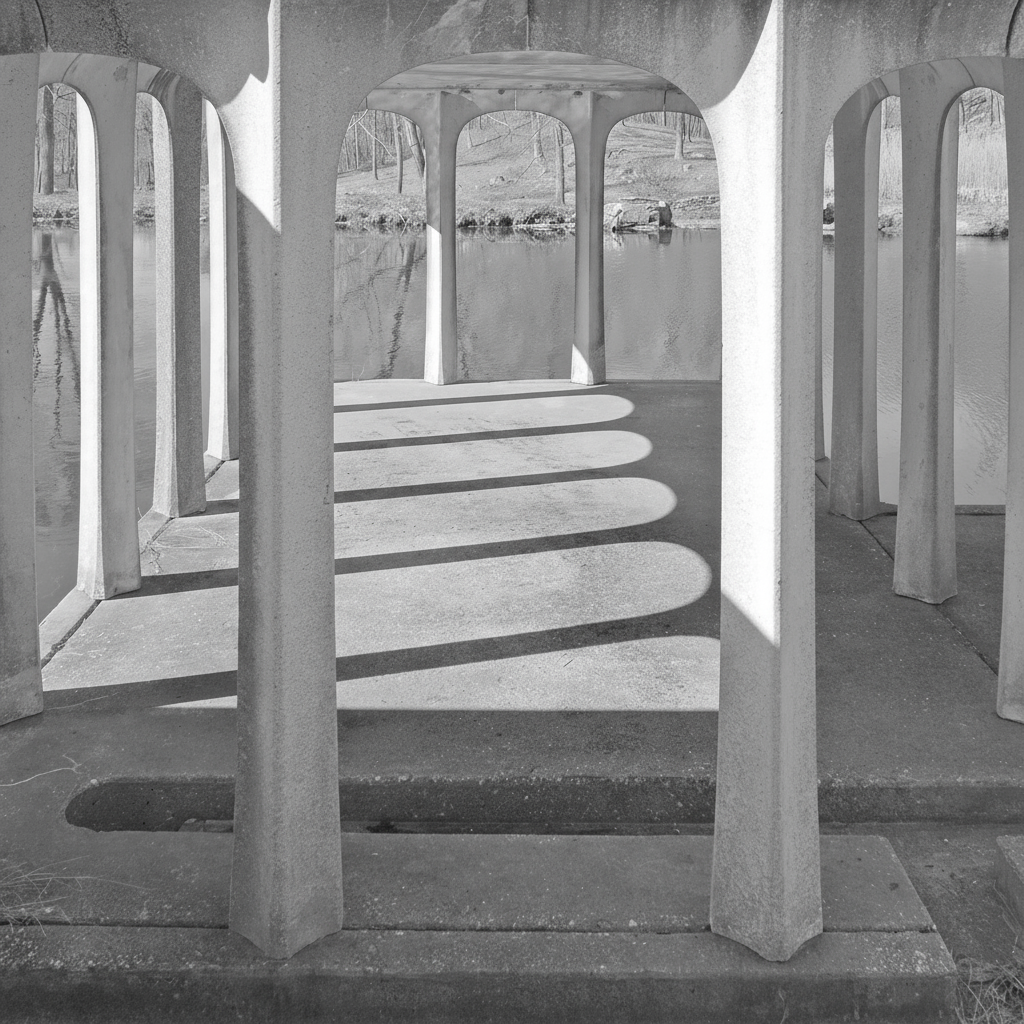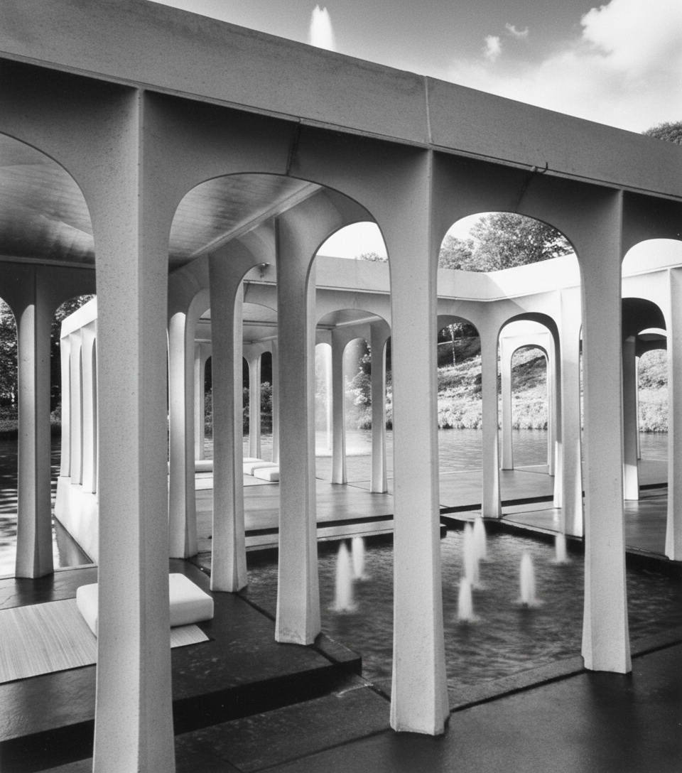 Lake Pavilion, Phillip Johnson: modelo matriz. Aporta la lógica peristilar y el pinwheel como diagrama motor; plintos, bandejas y pórticos abiertos.