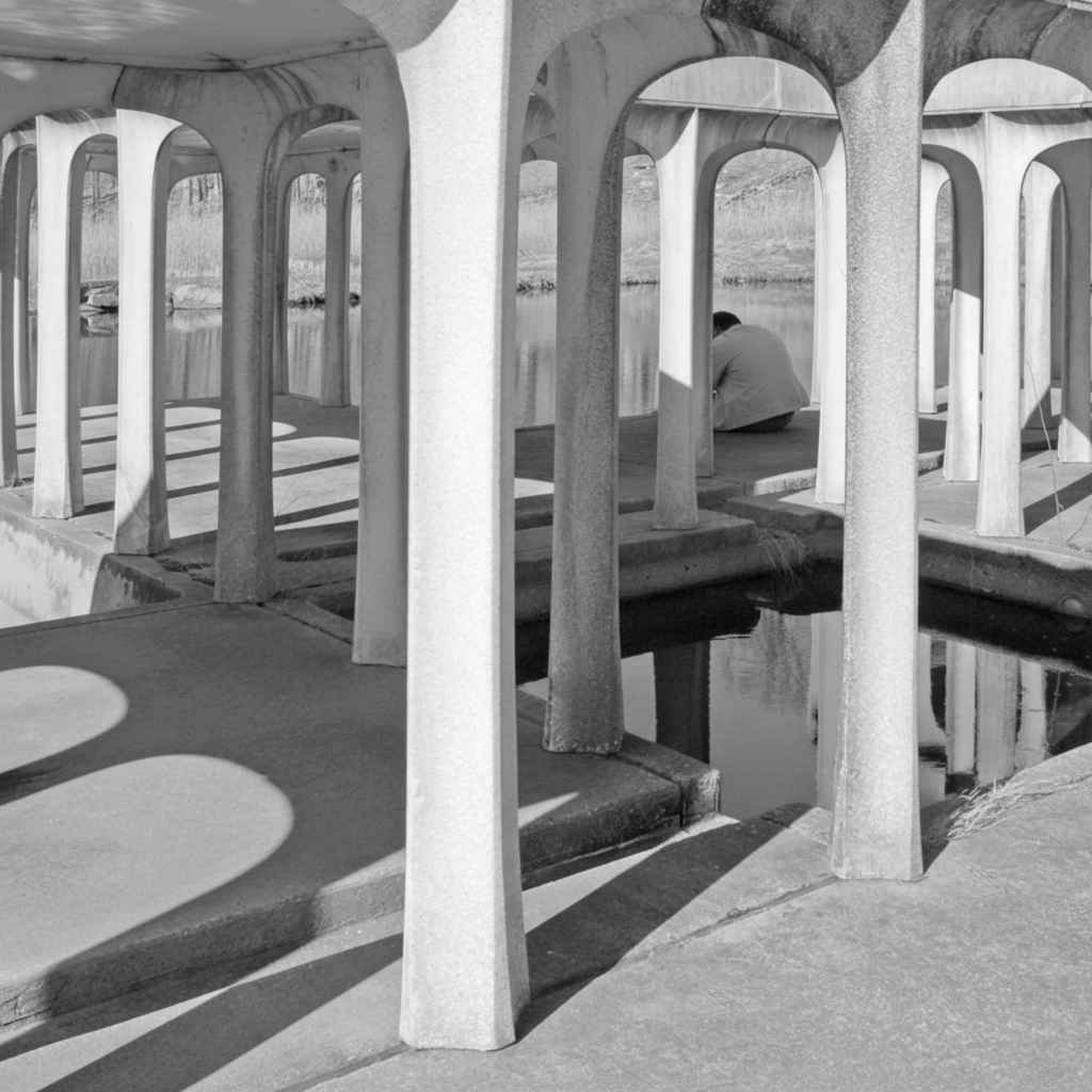 El pabellón se entiende como campo columnario. Un bosque de montantes delgados, de lectura homogénea (casi mono-sistémica), organiza el espesor sin apelar a muros: el vacío se talla por densidad de elementos lineales. La apilación baja de niveles (plataformas o entrepisos próximos) está atravesada por el mismo entramado, de modo que estructura y partición comparten gramática.